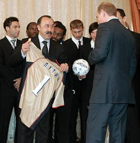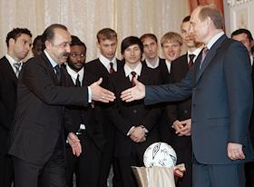 Президент России Владимир Путин (слева) пригласил футболистов ЦСКА и их тренера Валерия Газзаева,…
