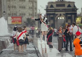 Выпускники средних школ купаются в фонтане на Поклонной горе.