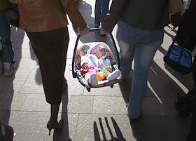 Женщины несут спящего ребенка по Невскому проспекту.