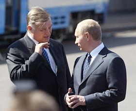 Президент России Владимир Путин (слева) и президент ОАО "Российские железные дороги" (РЖД) Владимир…