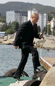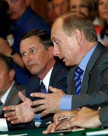 Президента России Владимир Путин (справа) и министр обороны России Сергей Иванов (слева) во время…