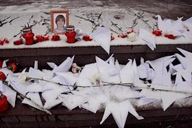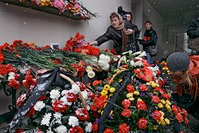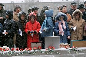 Панихида по погибшим при захвате заложников во время мюзикла "Норд-Ост" на площади перед театральным центром на Дубровке.