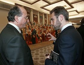 Художники Сергей Калинин (слева) и Фарид Богдалов (справа) на презентации своей картины "Заседание…