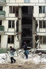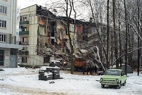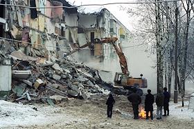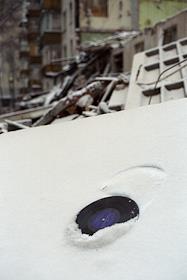 Виниловая пластинка лежит на снегу рядом с руинами снесенного пятиэтажного здания.