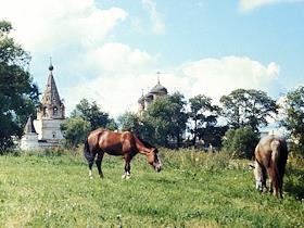 Виды Можайска. Лошади пасутся у стен монастыря.