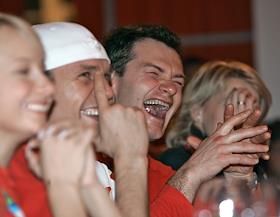 XX зимние Олимпийские игры 2006. Российский спортсмен Владимир Лебедев (в центре) празднует свою…