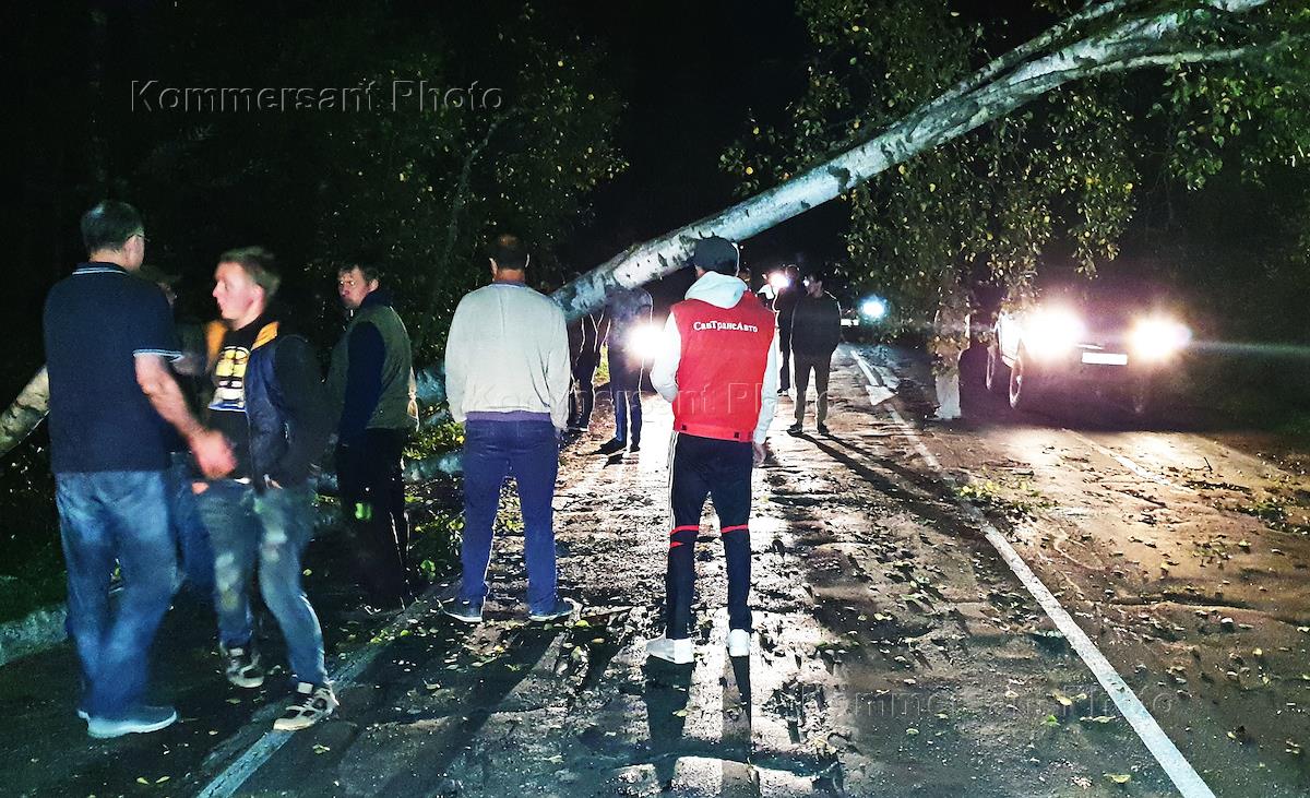 Последствия урагана - упавшее на дорогу дерево остановило движение. Водители расчищают дорогу.