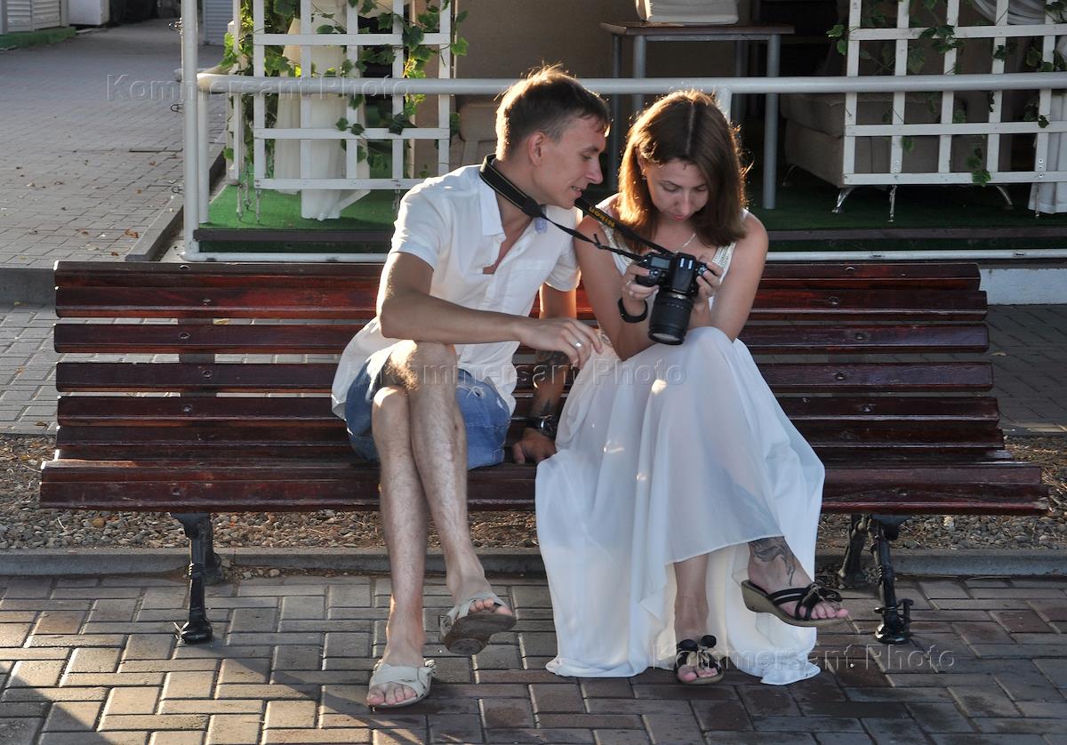 Жанровая фотография. Отдыхающие на скамейке рассматривают фотографии в фотоаппарате.