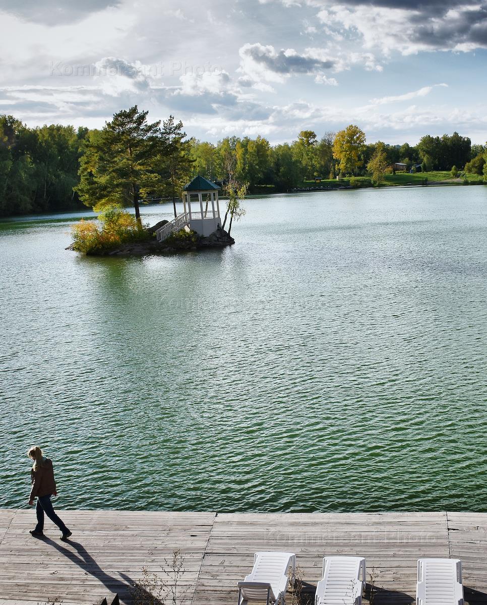 Туристический комплекс на озере Ая. Беседка на островке в центре озера.