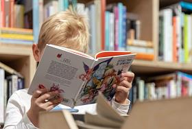 Жанровая фотография. Ребенок с раскрытой книгой в книжном магазине.
