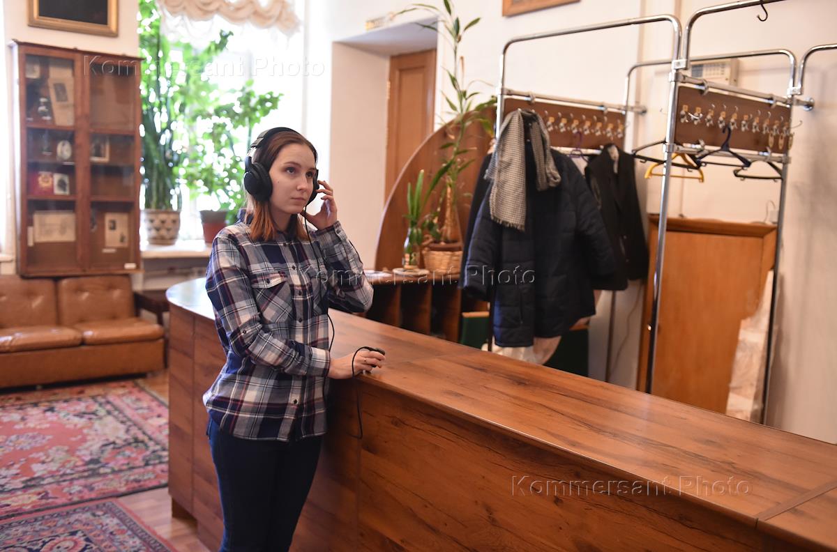 Интерьеры библиотеки Союза театральных деятелей (СТД). Сотрудница библиотеки в читальном зале.