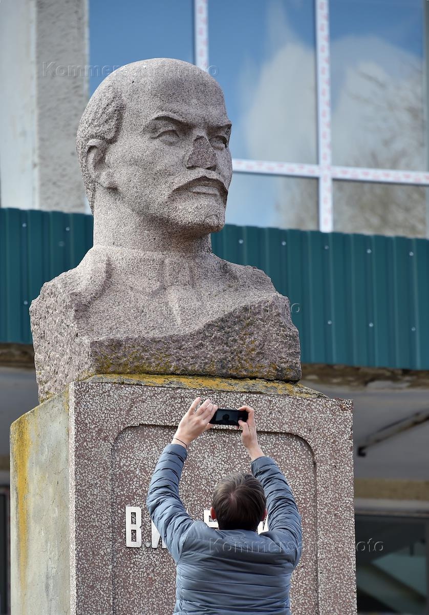 Виды Гагаузии. Жанровая фотография. Мужчина фотографирует на мобильный телефон памятник вождю…