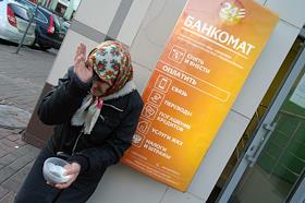 Жанровая фотография. Пожилая женщина просит милостыню у офиса "Сбербанка".