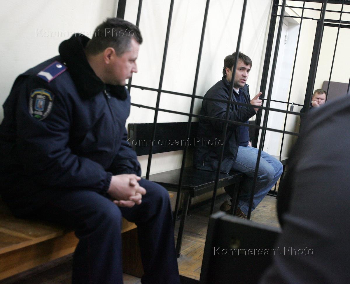 Подсудимый, владелец Киевского универсального банка (КУБ) Петр Борисихин (за решеткой) во время…