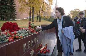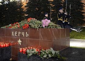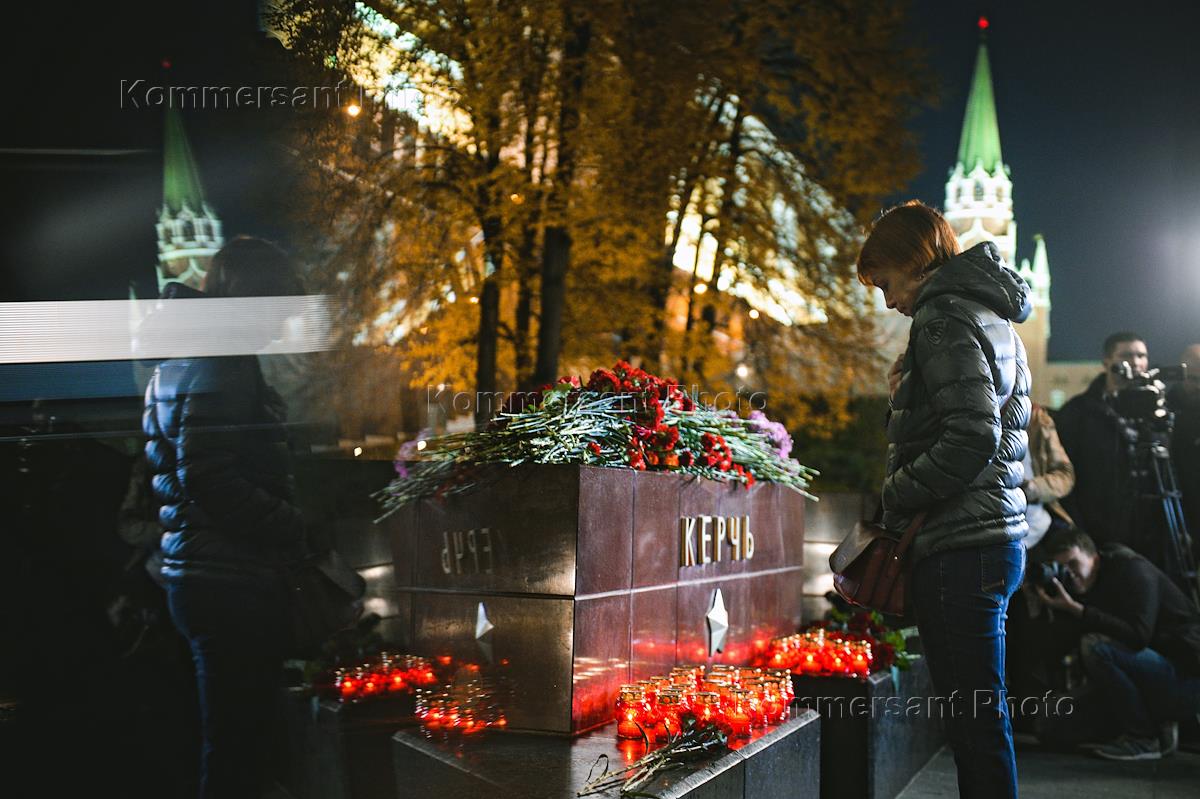 Общество Москвичи несут цветы и свечи к стеле города-героя Керчь в Александровском саду в память о жертвах взрыва в Керченском технологическом техникуме.