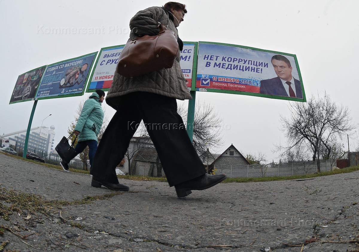 Выборы главы и депутатов народного совета Луганской Народной Республики. Рекламный щит с…