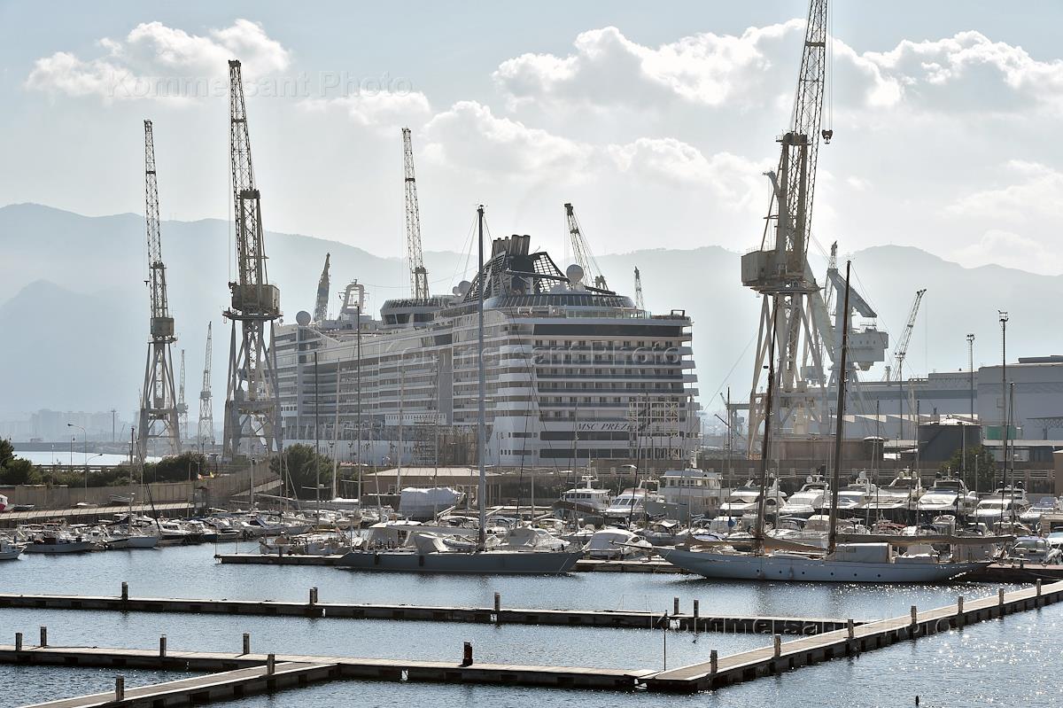 Виды Палермо. Круизный теплоход в морском порту.
