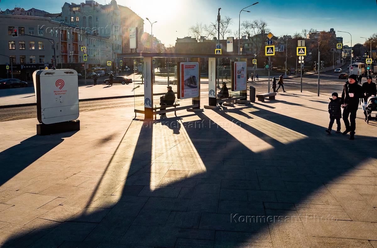 Жанровая фотография. Пассажиры в ожидании автобуса на автобусной остановке.