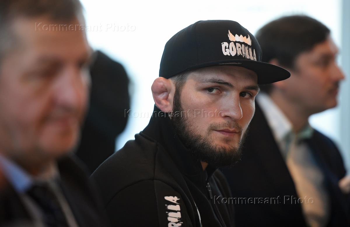 Боец смешанных боевых искусств Хабиб Нурмагомедов во время пресс-конференции, посвященной победе над…