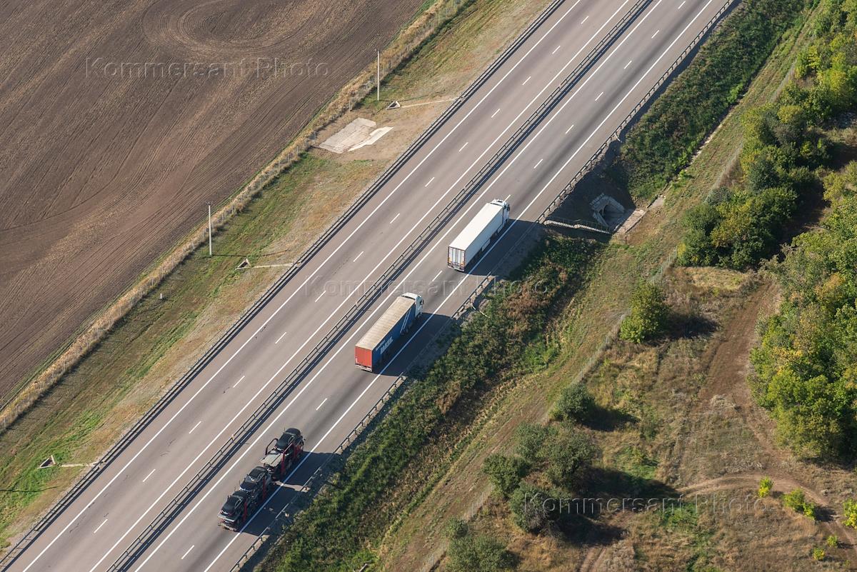Жанровая фотография. Грузовые машины едут по шоссе.