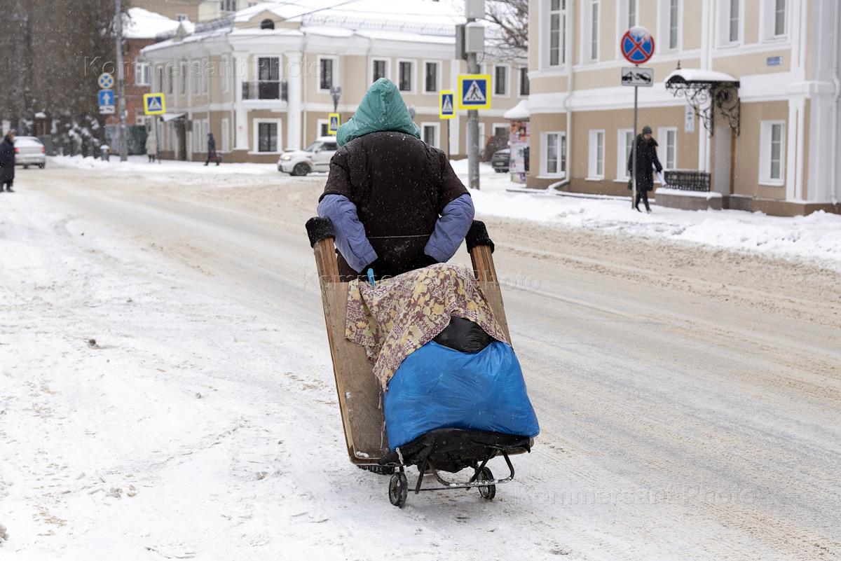 Жанровая фотография. Пожилая женщина везет тележку с товаром с мини-рынка.