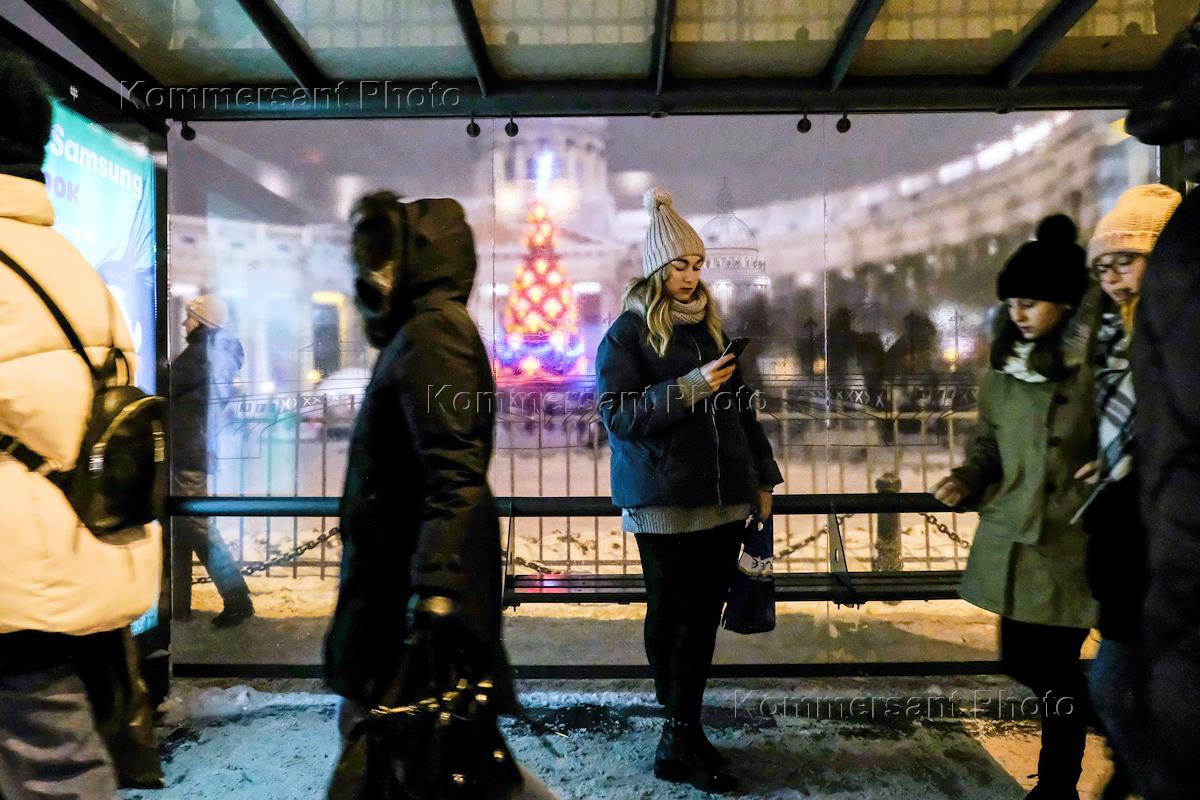 Жанровая фотография. Подготовка к празднованию Нового года. Девушка стоит на остановке общественного…