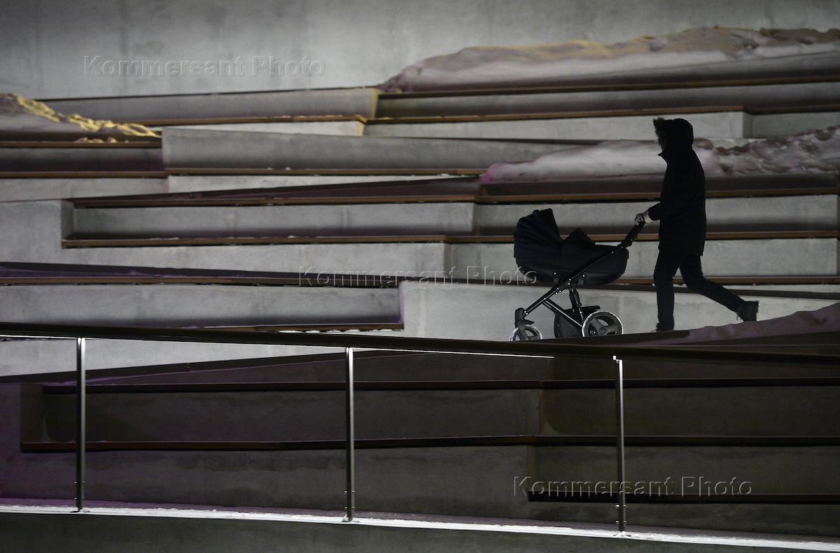 Жанровая фотография. Молодая мама с детской коляской на прогулке в Парке Горького.