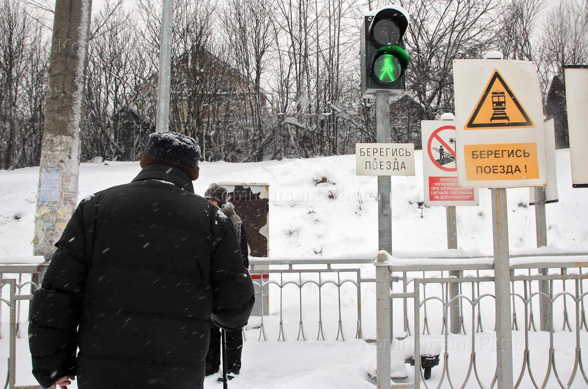 Жанровая фотография. Пешехожный переход через железную дорогу. Светофор и надпись "Берегись поезда".