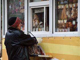 Жанровая фотография. Пожилая женщина у хлебного ларька.