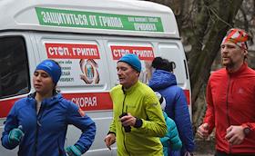 Жанровая фотография. Автомобиль службы профилактики гриппа. Люди занимаются спортом.