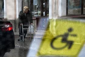 Жанровая фотография. Пожилой мужчина-инвалид с "ходунками" во время перемещения по тротуару.