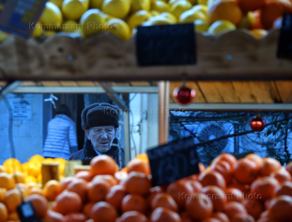 Жанровая фотография. Пожилой мужчина у витрины овощного ларька.