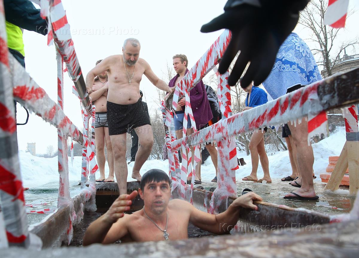 Праздник Крещения Господня. Крещенские купания в купели возле Храма иконы Божья Матери на проспекте…