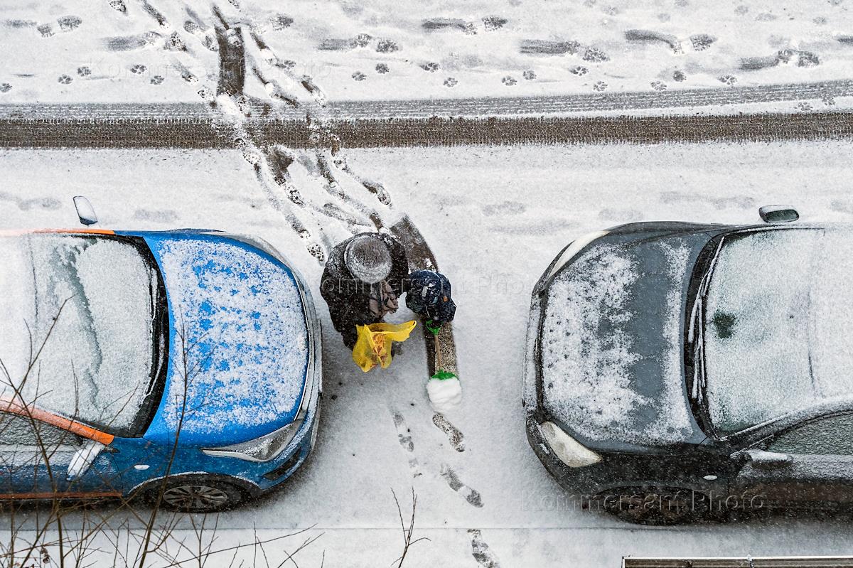 Жанровая фотография. Снегопад в Москве. Женщина с ребенком проходит между припаркованными…