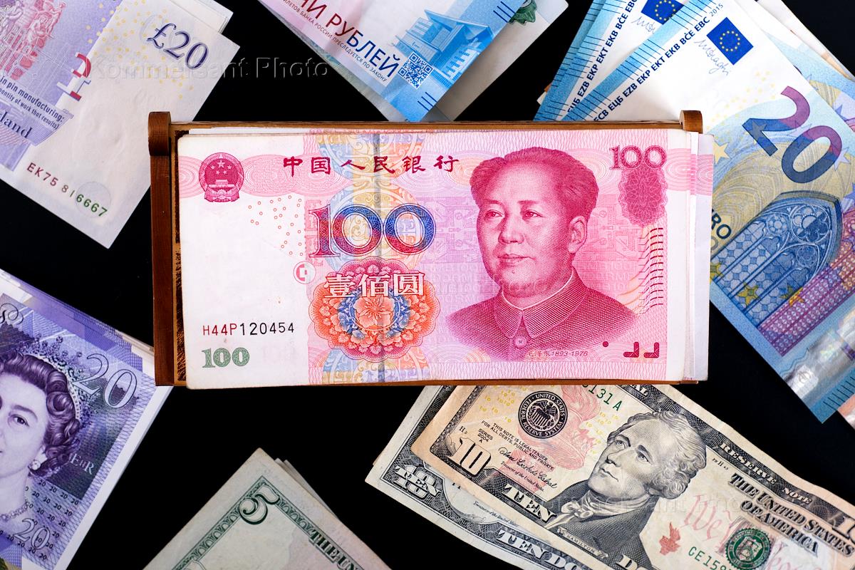 Жанровая фотография. Купюра в 100 юаней и бумажные купюры США, России, Великобритании.