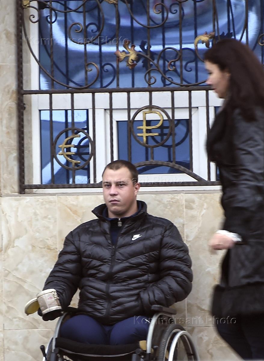 Жанровая фотография. Мужчина на инвалидной коляске просит милостыню возле пункта обмены валют.