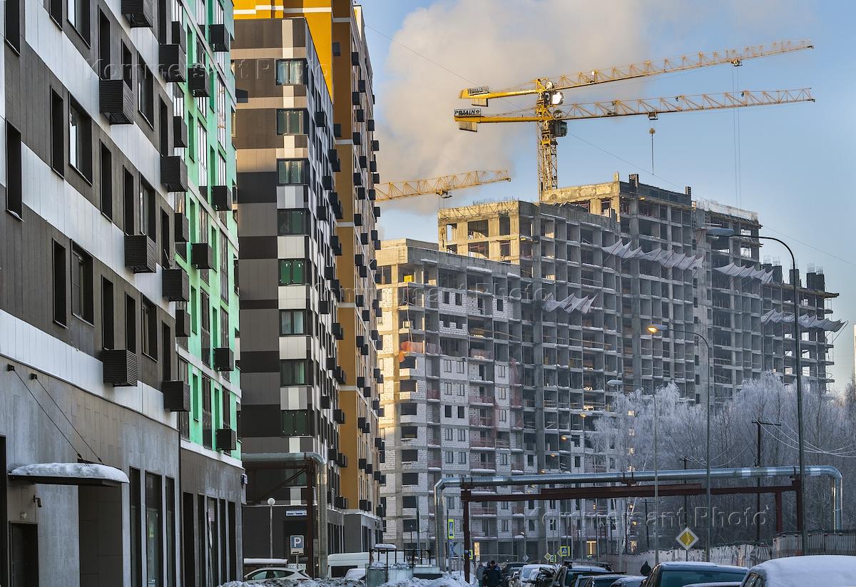 Жанровая фотография. Строящееся многоэтажное здание на фоне новой жилой многоэтажки.
