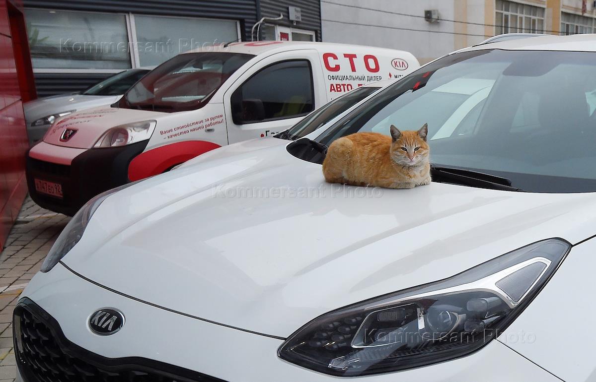 Жанровая фотография. Кошка сидит на капоте автомобиля.