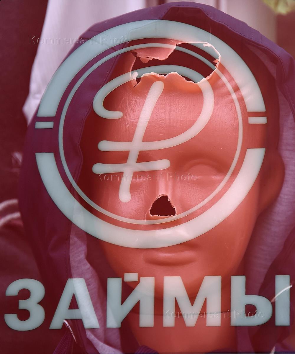 Жанровая фотография. Эмблема кредитной организации с символом рубля и дырявый манекен в витрине.