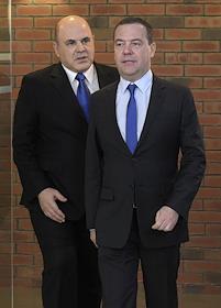 Председатель правительства России Дмитрий Медведев (справа) и руководитель Федеральной налоговой…
