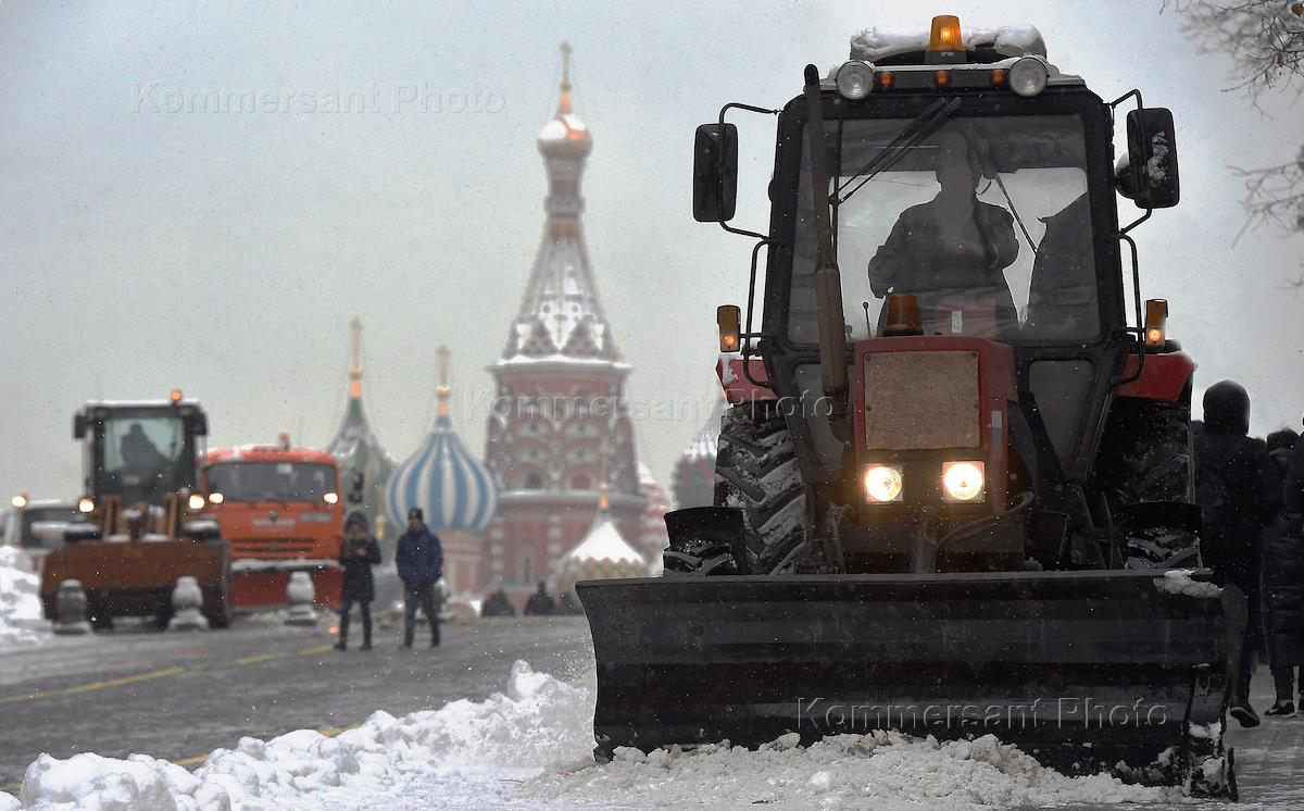 Жанровая фотография. Снегопад в городе. Спецтехника на Красной площади во время расчистки снега.