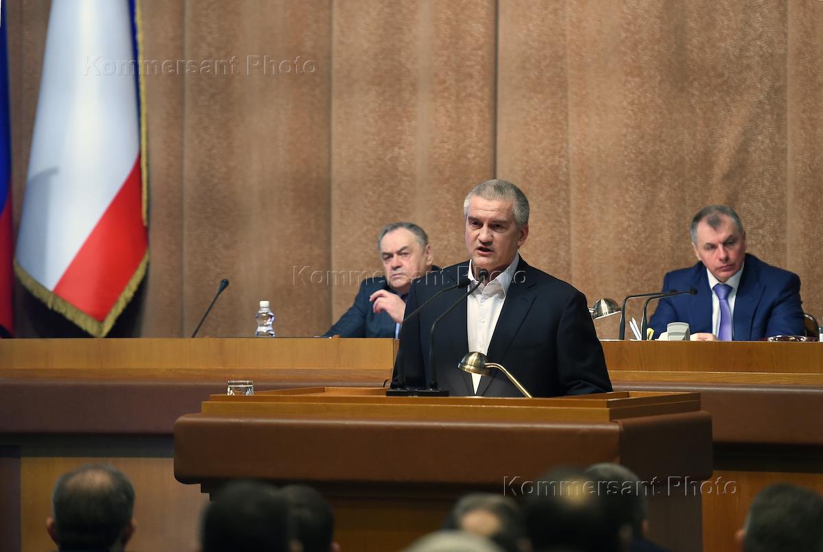 Глава Республики Крым Сергей Аксенов (в центре) во время отчета о результатах деятельности Совета…