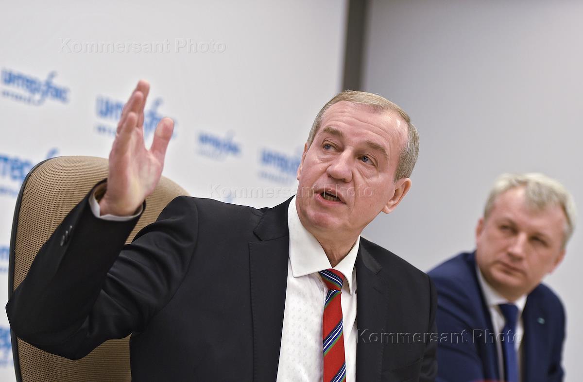 Губернатор Иркутской области Сергей Левченко (слева) во время пресс-конференции в центральном офисе…