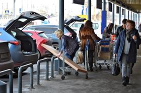 Акция "День без турникетов" в магазине "Икеа Химки". Покупательница закружает покупки в автомобиль.