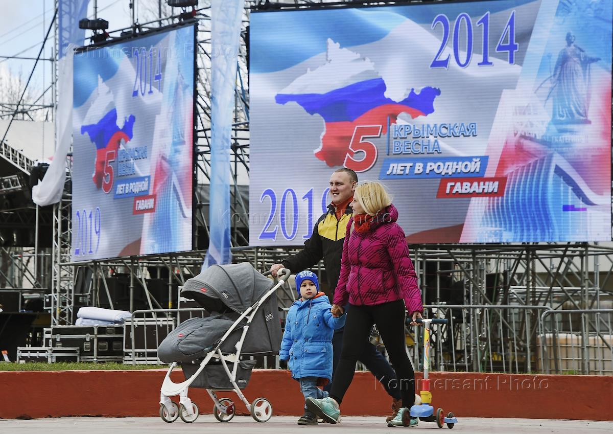 Жанровая фотография. Семья идет мимо плаката "Крымская весна. 5 лет в родной говани"