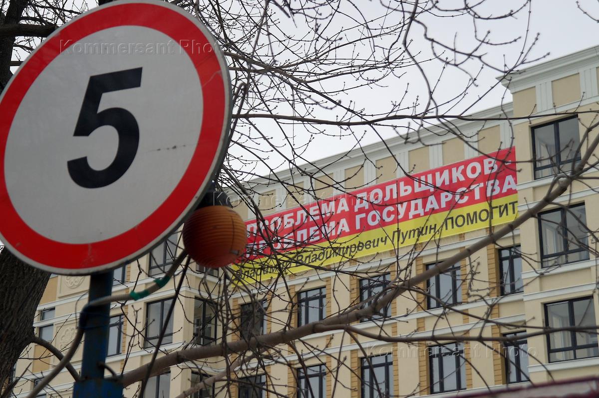 Плакат с обращением к президенту России Владимиру Путину на фасаде недостроенного дома жилого…