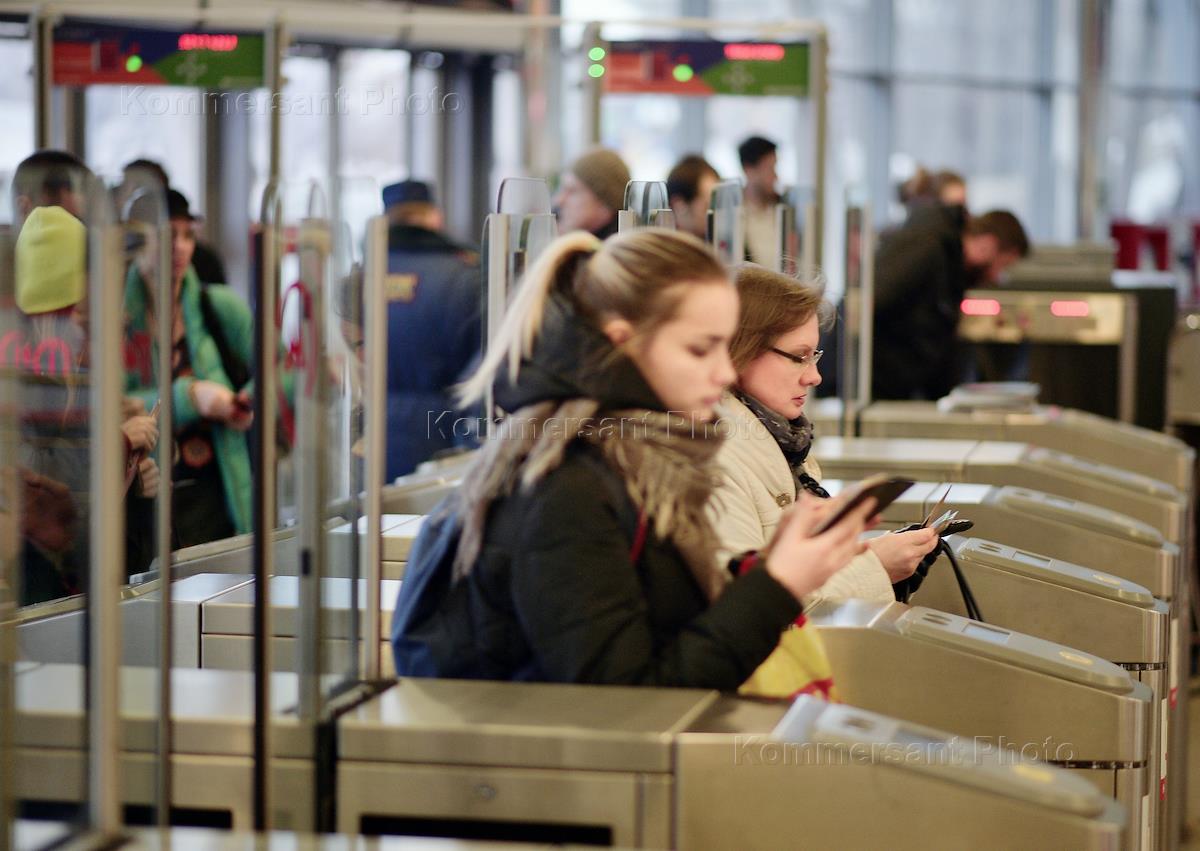 Жанровая фотография. Пассажиры в вестибюле станции Московского центрального кольца (МЦК) "Лужники".