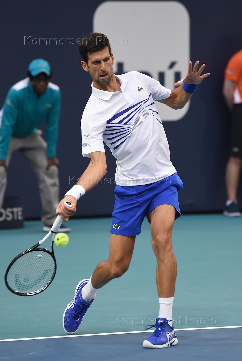 Теннисный турнир Miami Open. Сербский теннисист Новак Джокович во время матча с аргентинским…