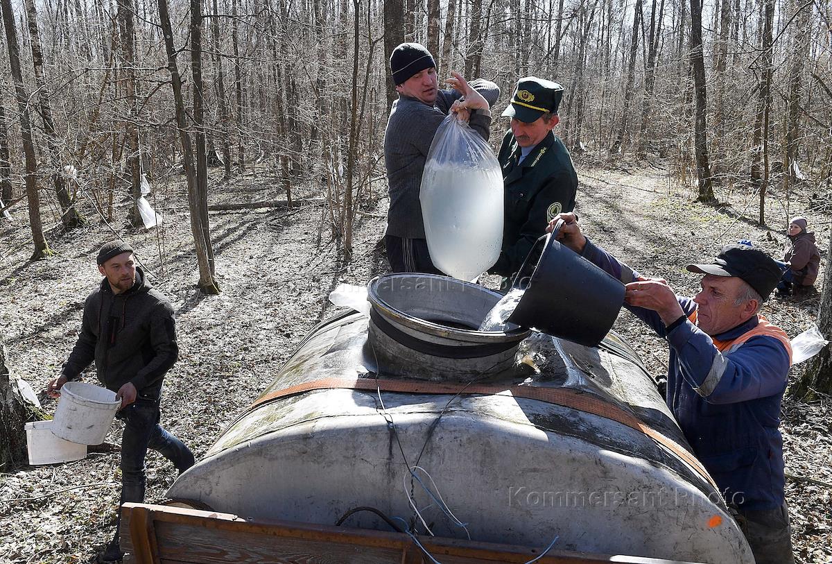 Лесники и наемные рабочие Лунинецкого лесхоза во время сбора березового сока.