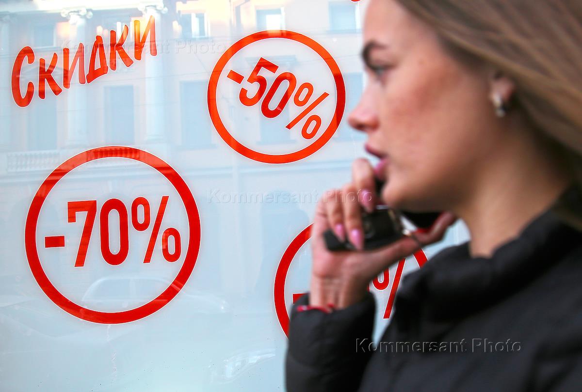 Жанровая фотография. Девушка с телефоном у рекламного баннера с надписью "Скидки".